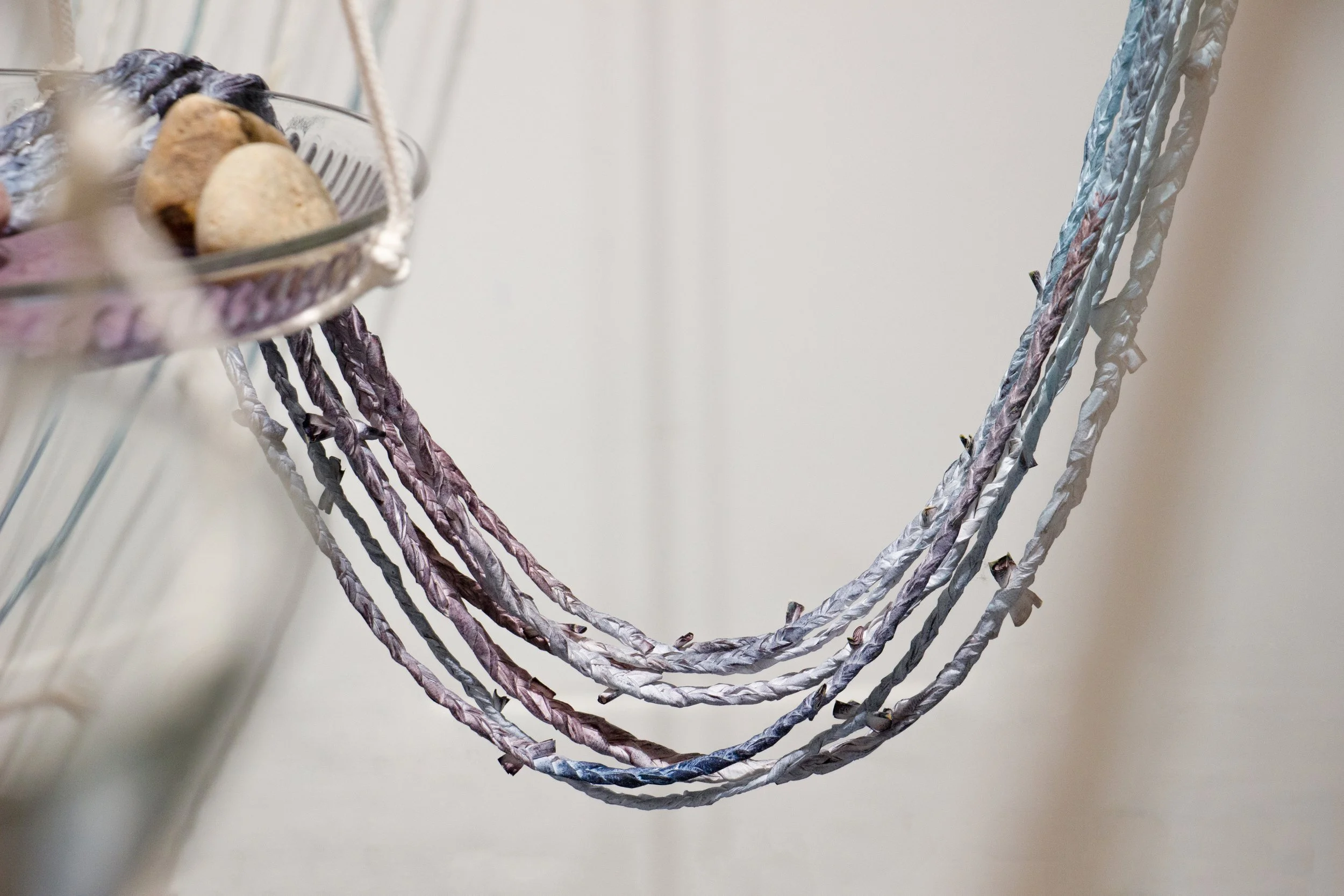 Weight of Time 2025, Earth and watercolor-dyed paper, paper spread below, glass vessel, rope and stones, 53" x 60" x 31"